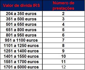 O número de prestações a solicitar pode variar entre 2 até ao máximo de 12, dependendo do valor a pagar, tal como consta na tabela seguinte.